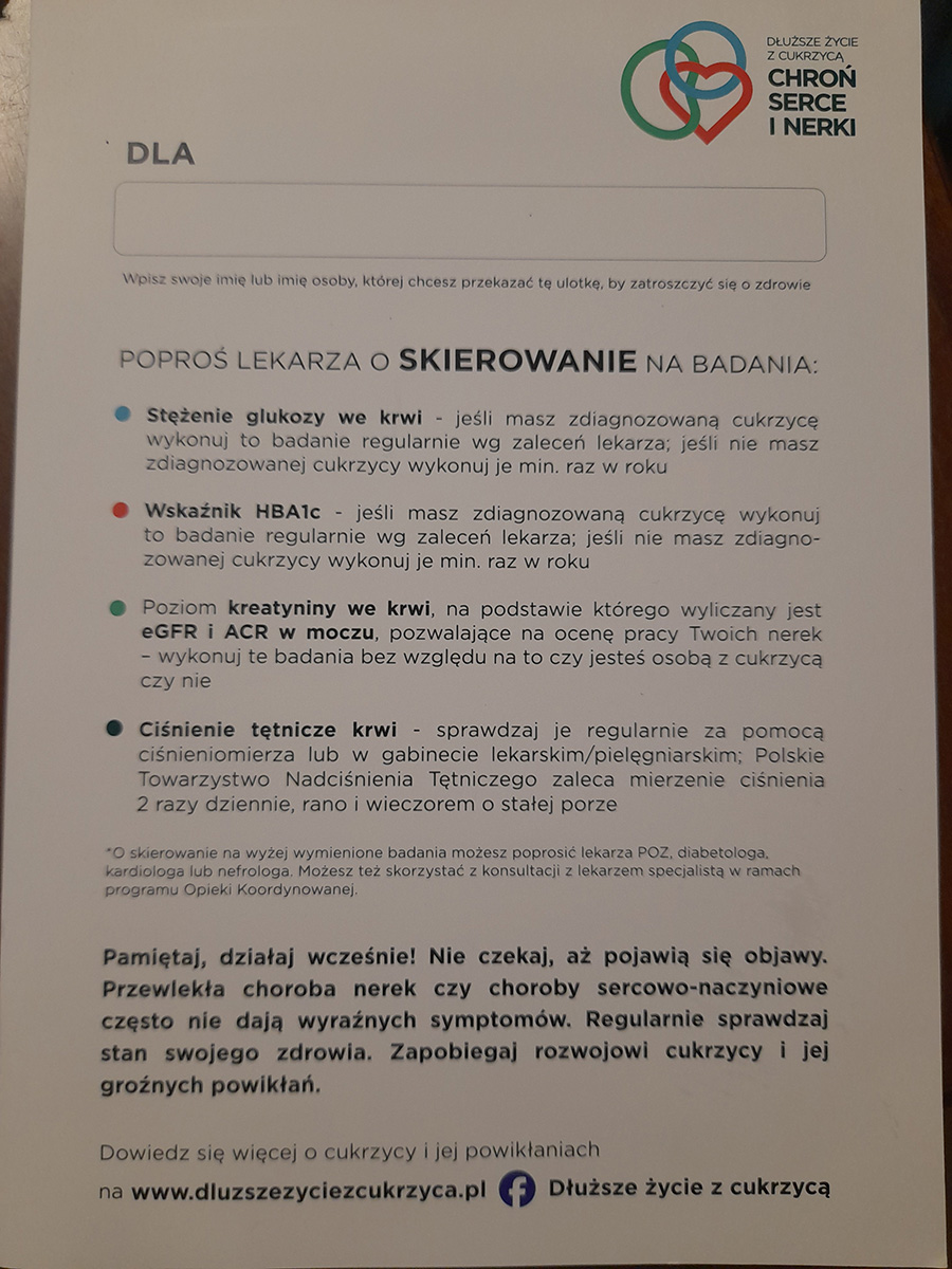 Ważnym tematem wspierającym, a także mobilizującym osoby chore na cukrzycę są nieodpłatne badania profilaktyczne oraz pielęgnacja stopy cukrzycowej .